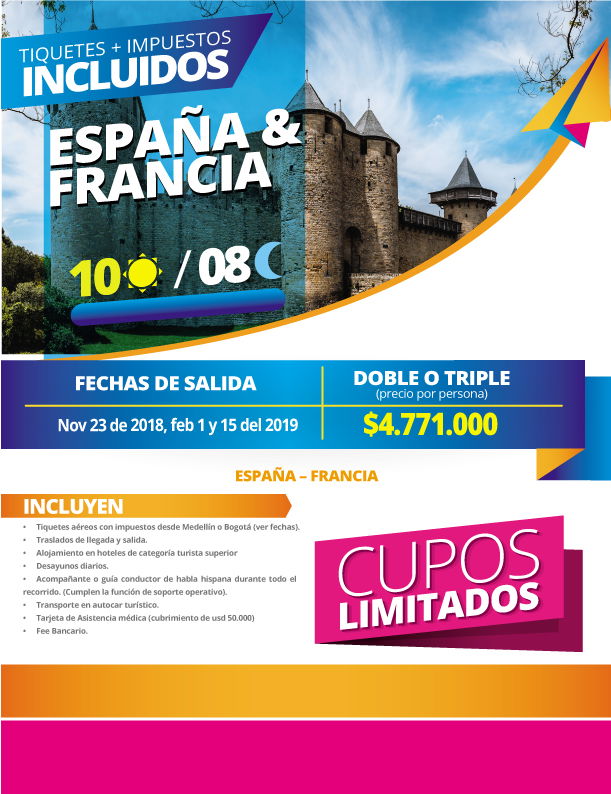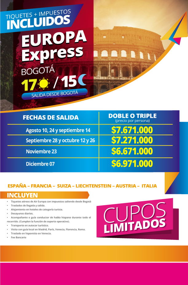 Europa a tu alcance. Las mejores ofertas de viajes a Europa desde Colombia, para que descubras lugares históricos, sitios turísticos, románticos e increíbles. Con promociones que no puedes dejar pasar; vivirás la mejor de las experiencias. Recorre los principales países de Europa, como España, Francia, Italia, Suiza, Alemania, Grecia. Te damos las mejores opciones para que elijas a tu gusto y hagas tus sueños realidad. pregúntanos por nuestras salidas grupales con fechas especificas todo el año y las salidas individuales segun tu disponibilidad